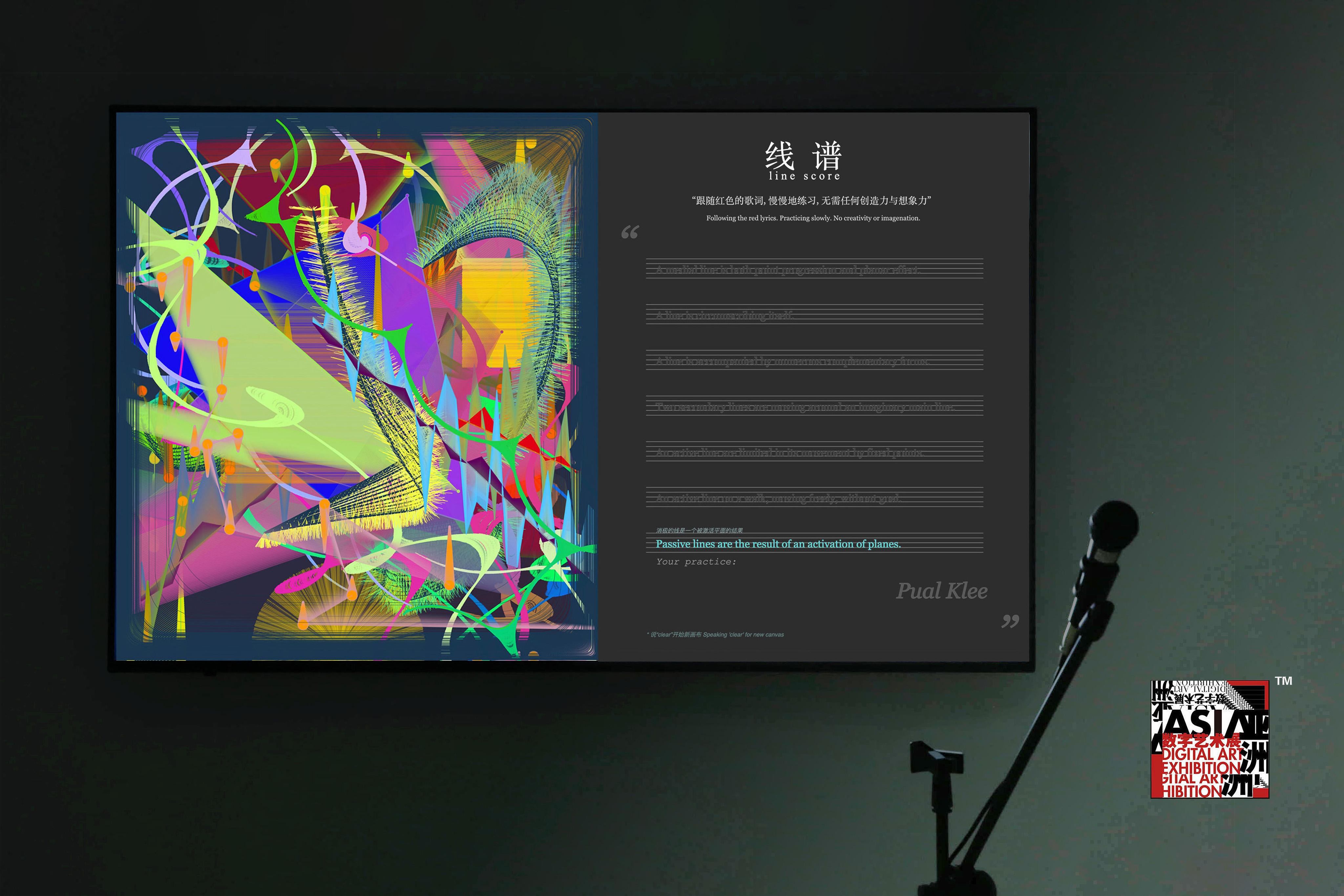 线谱是一件交互的生成艺术作品。在作品中,观众通过说话行为参与,跟随谱上的“歌词”顺序和内容反复练习,就像体验练习歌唱或者读诗一样,并可以无止境的重复这个过程。作品鼓励缓慢而耐心地练习,以体验与“歌词”相对应的视觉形式的变化、力量关系和相互作用。观众跟随线谱上的内容说话时,图形生成程序会根据其的含义以动态方式生成由“线”构成的抽象图形,并不断重叠成的抽象画面。希望观众通过重复练习的行为,持续尝试生成有节奏形式的画面。参与者在这个过程中既是艺术生产的实践者,也是受益者。作品的灵感来自于激浪派的观念艺术作品“事件谱”,这是用于参照重演并体验行为艺术的简短文本指南。本作品使用Paul Klee笔记中的对图形的基本要素“线”的描述内容作为“谱”,通过众多观众不断以说话行为参与、实践、迭代来生成图形,期待唤起参与者对于初级形式的节奏感和美感的意识和在存粹形式中的感知体验。